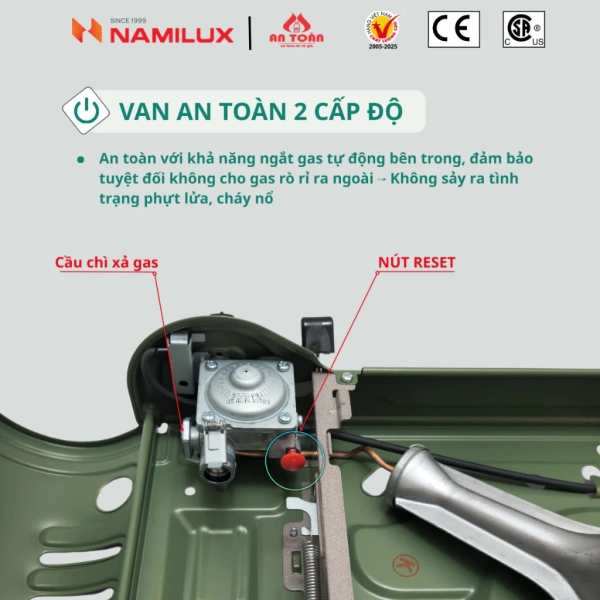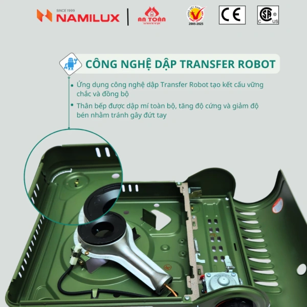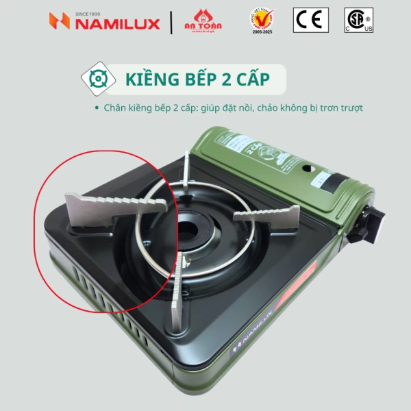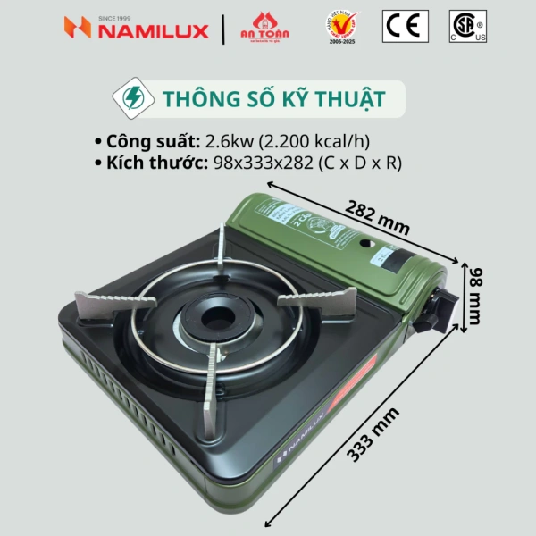 Bếp có công suất 2.6kW (2200 kcal/h) cho lửa mạnh nấu nhanh, dùng lon gas mini Namilux/Mother, trang bị an toàn theo model (2S/Inline Cut).