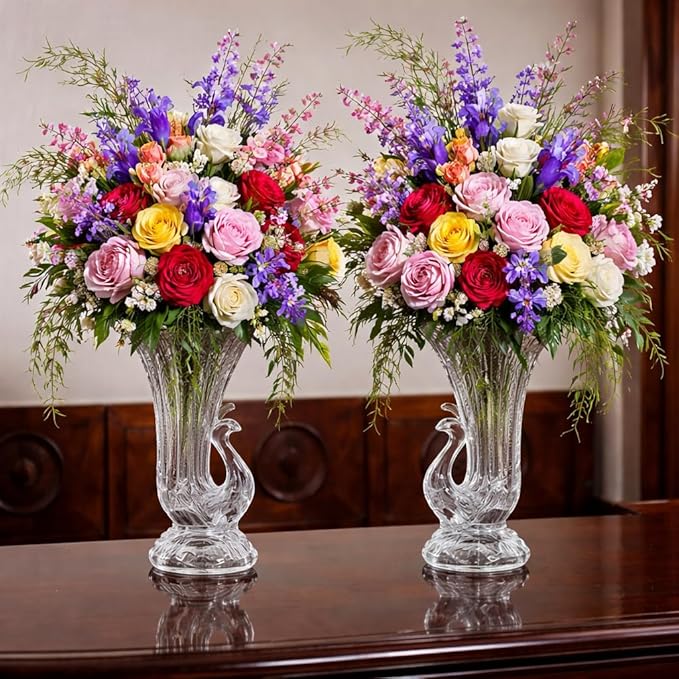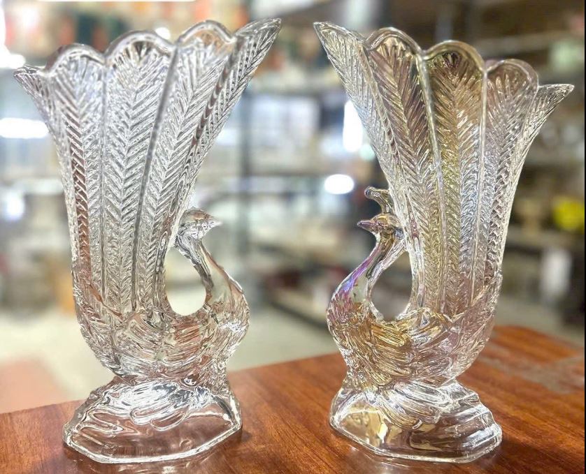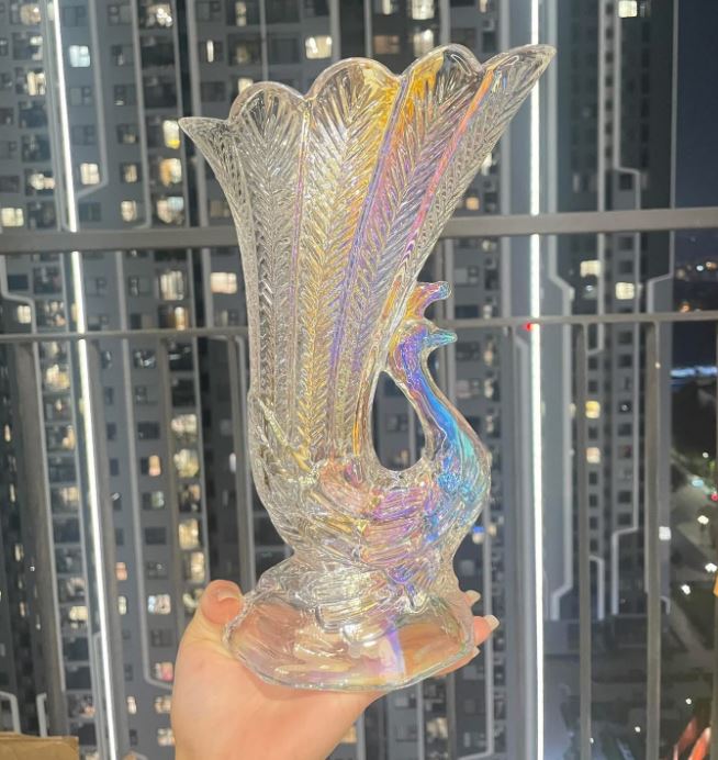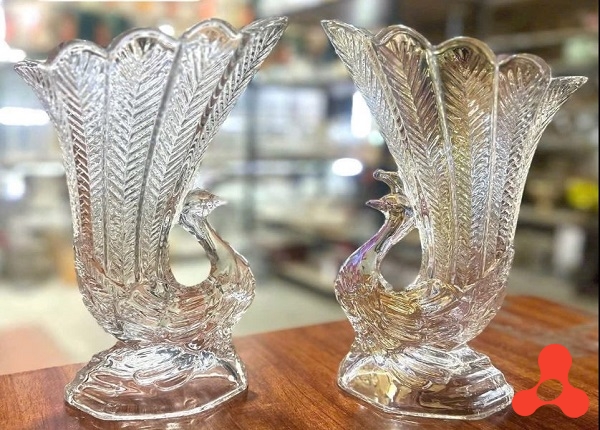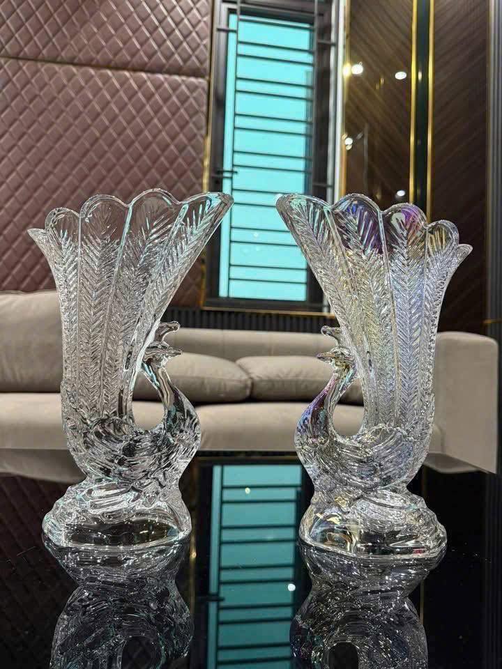 Sản phẩm trong ảnh là cặp lọ hoa thủy tinh hình con công
