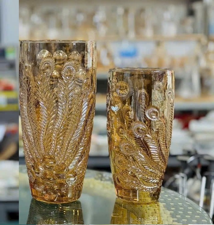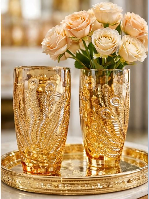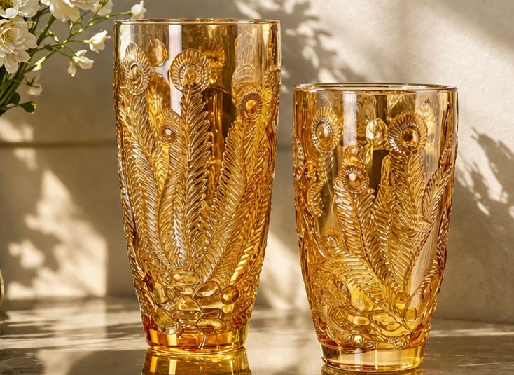 Bình cắm hoa thủy tinh vàng 25cm họa tiết công mang đến vẻ đẹp tinh tế và sang trọng cho không gian sống. Hình ảnh chim công – biểu tượng của sự quyền quý, may mắn và tài lộc – giúp sản phẩm không chỉ là vật dụng trang trí mà còn mang ý nghĩa phong thủy tốt đẹp.
