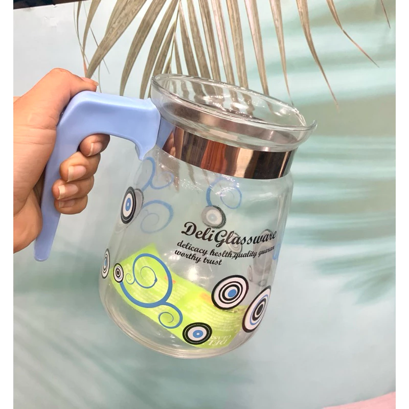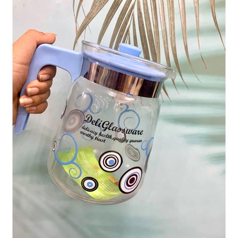 Bình Nước Thủy Tinh Hoa Xanh Trắng Có Quai Nắp Xanh Lá 1500ML Deli R369E