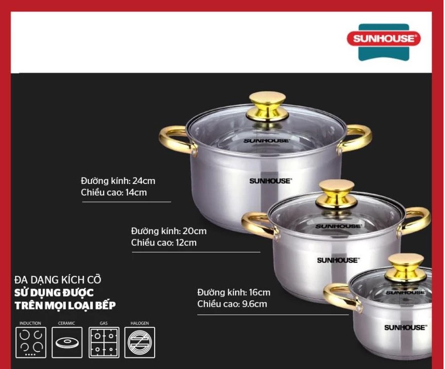 Bộ nồi Sunhouse SH781, Bộ nồi inox SH781