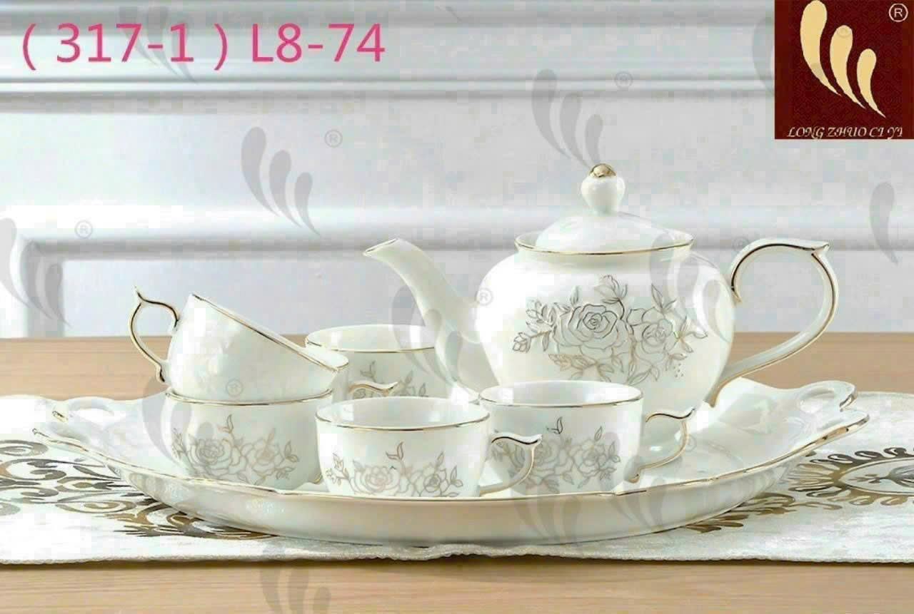 • BỘ BÌNH TRÀ CHÉN SỨ HOA NHỦ VIỀN VÀNG KÈM KHAY