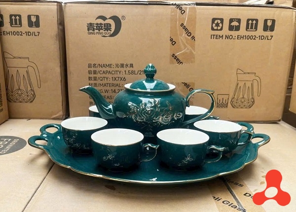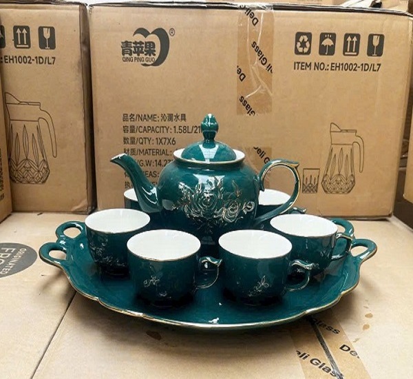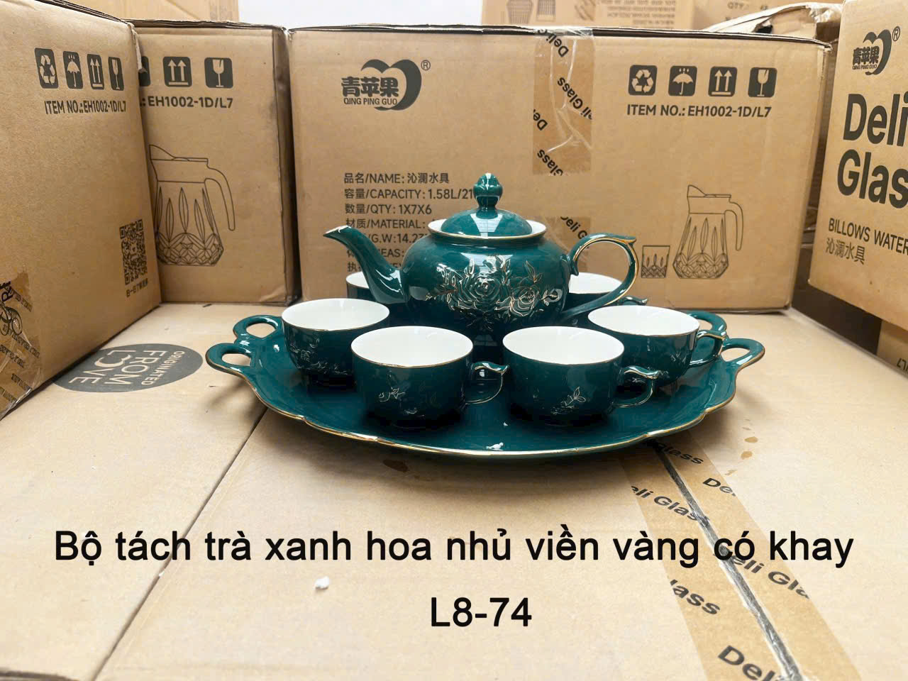BỘ BÌNH TRÀ GỐM SỨ HOA XANH NHỦ VIỀN VÀNG CÓ KHAY
