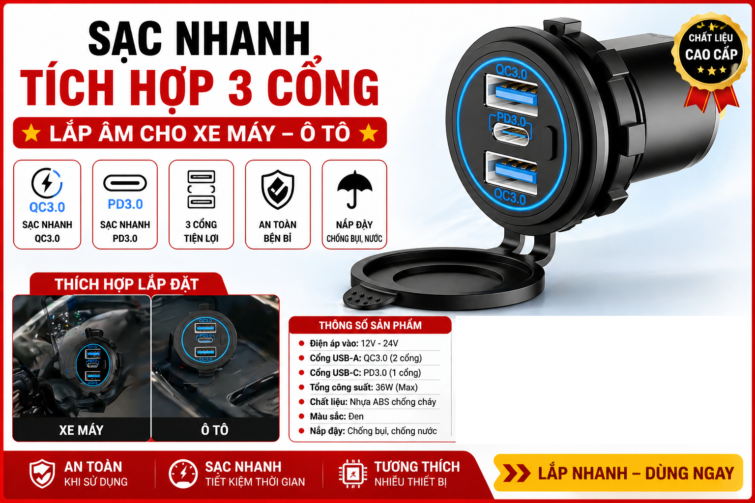 Bộ sạc USB 12V đa năng là phụ kiện không thể thiếu cho xe máy, ô tô, giúp sạc nhanh điện thoại và các thiết bị điện tử mọi lúc mọi nơi. Sản phẩm trang bị 2 cổng USB QC3.0 + 1 cổng Type-C PD, hỗ trợ sạc nhanh hiện đại, kèm nắp đậy chống nước an toàn khi sử dụng ngoài trời.