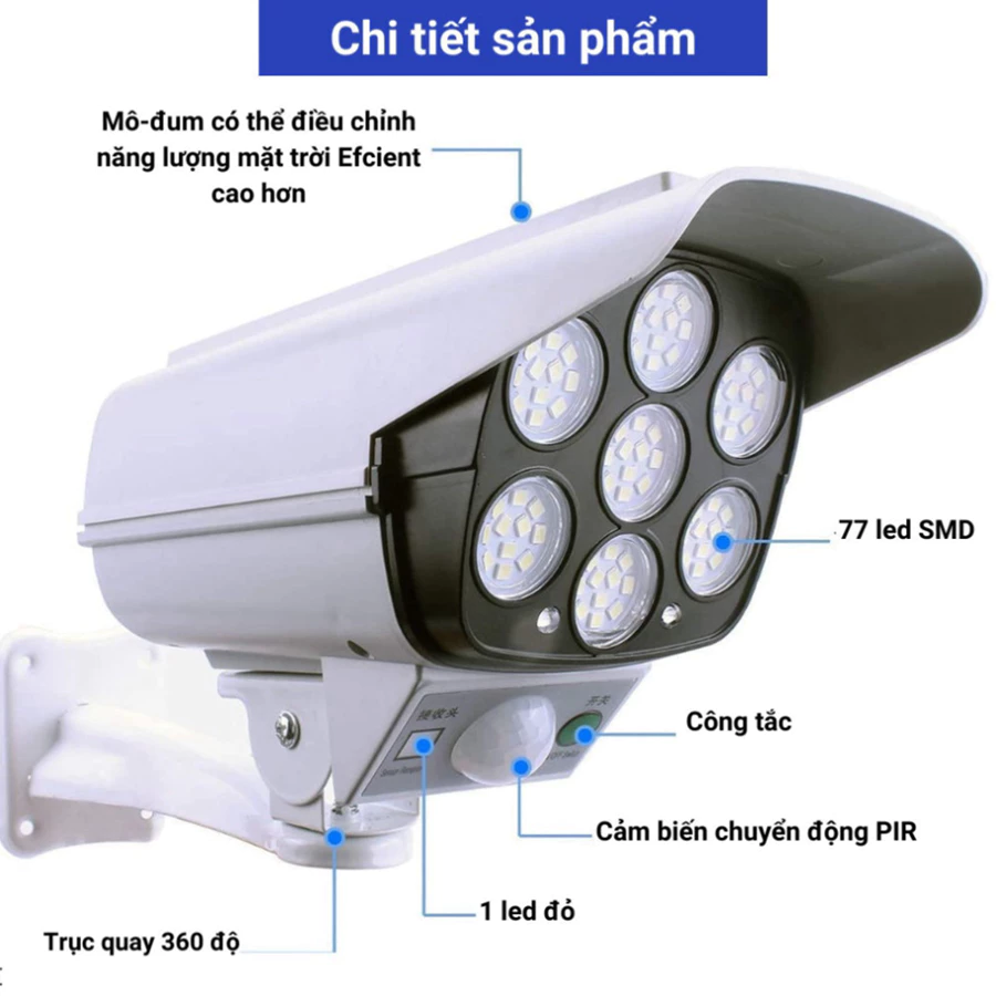 - Sản phầm gồm có: Đèn năng lượng mặt trời giả camera, remote điều khiển từ xa, bách, ốc vít đi kèm đầy đủ.
