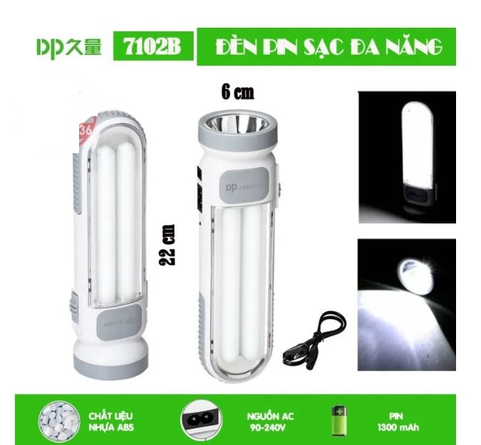 - Đèn pin sạc LED thông minh 3 chế độ DP 7102B sử dụng đèn LED công nghệ mới để chiếu sáng, cho chất lượng ánh sáng tốt, sáng đều, không nhấp nháy.