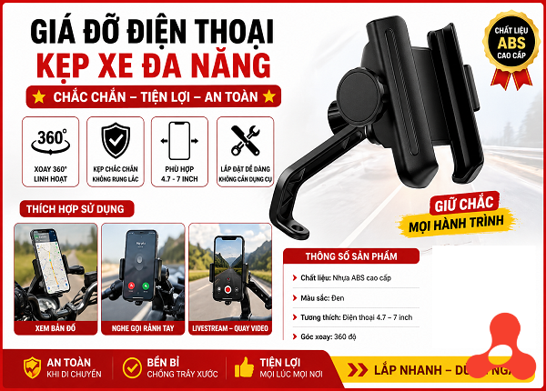 Giá đỡ điện thoại kẹp xe máy là phụ kiện cực kỳ cần thiết giúp cố định điện thoại trên tay lái hoặc gương chiếu hậu. Sản phẩm hỗ trợ người dùng dễ dàng xem bản đồ, nghe gọi, theo dõi GPS mà vẫn đảm bảo an toàn khi lái xe.