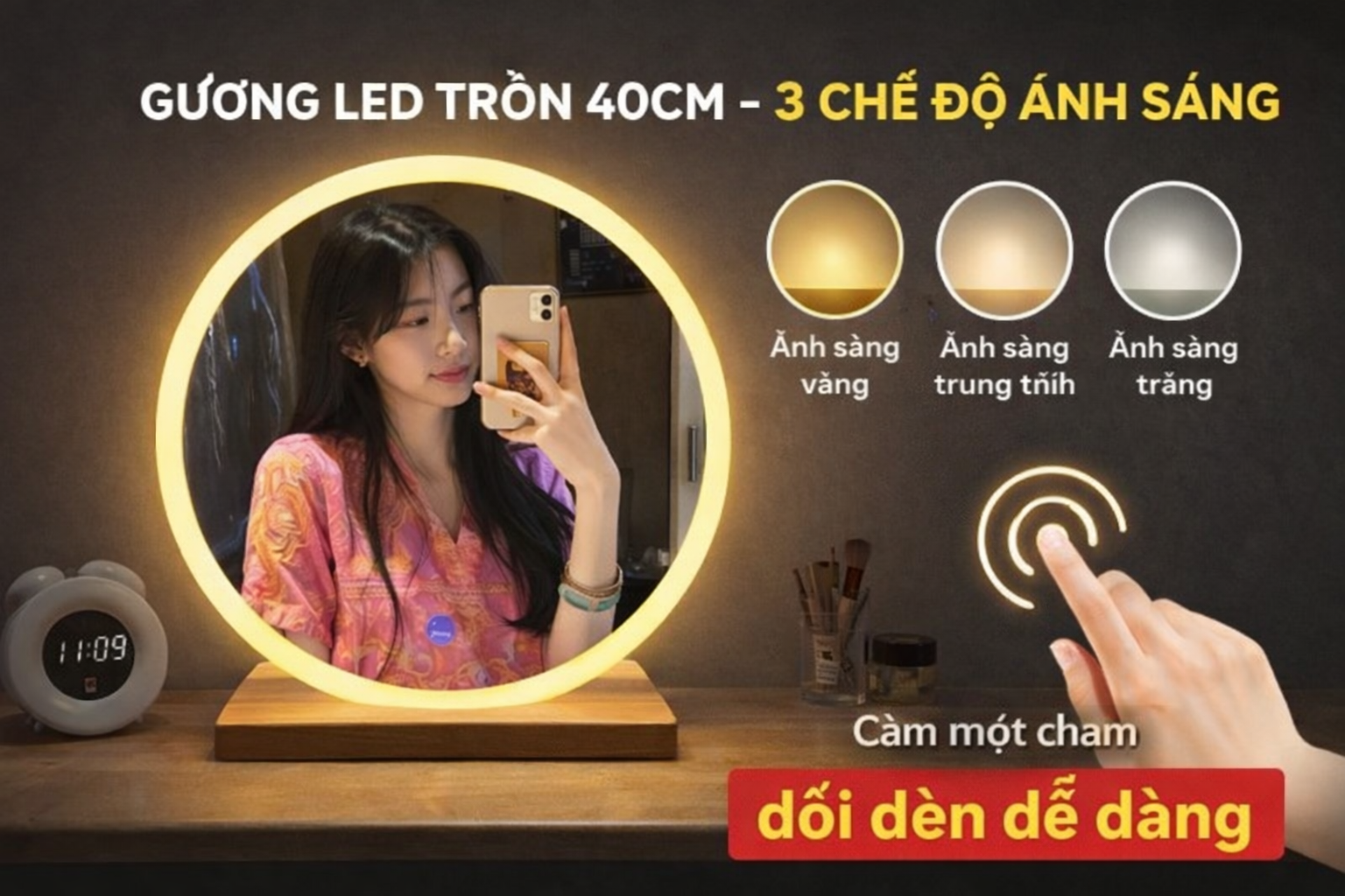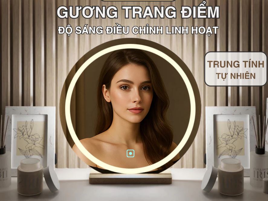 Sản phẩm có 3 chế độ ánh sáng (trắng – vàng – trung tính) phù hợp nhiều nhu cầu sử dụng khác nhau, từ trang điểm ban ngày đến buổi tối.