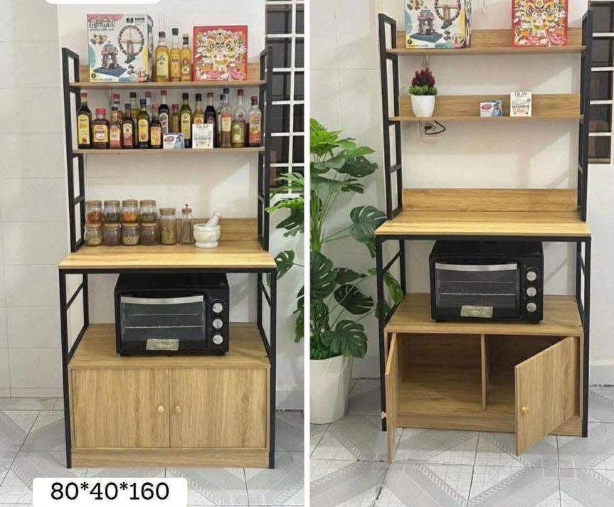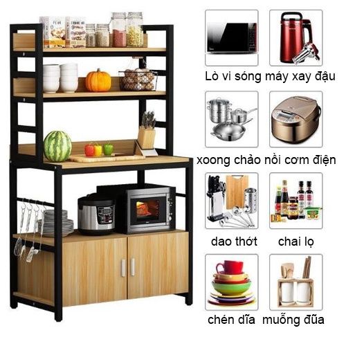Kệ lò vi sóng 3 tầng khung sắt kết hợp tủ đựng là giải pháp lưu trữ thông minh cho không gian bếp hiện đại. Thiết kế đa năng giúp bạn sắp xếp lò vi sóng, nồi cơm điện, gia vị và dụng cụ nhà bếp một cách gọn gàng.