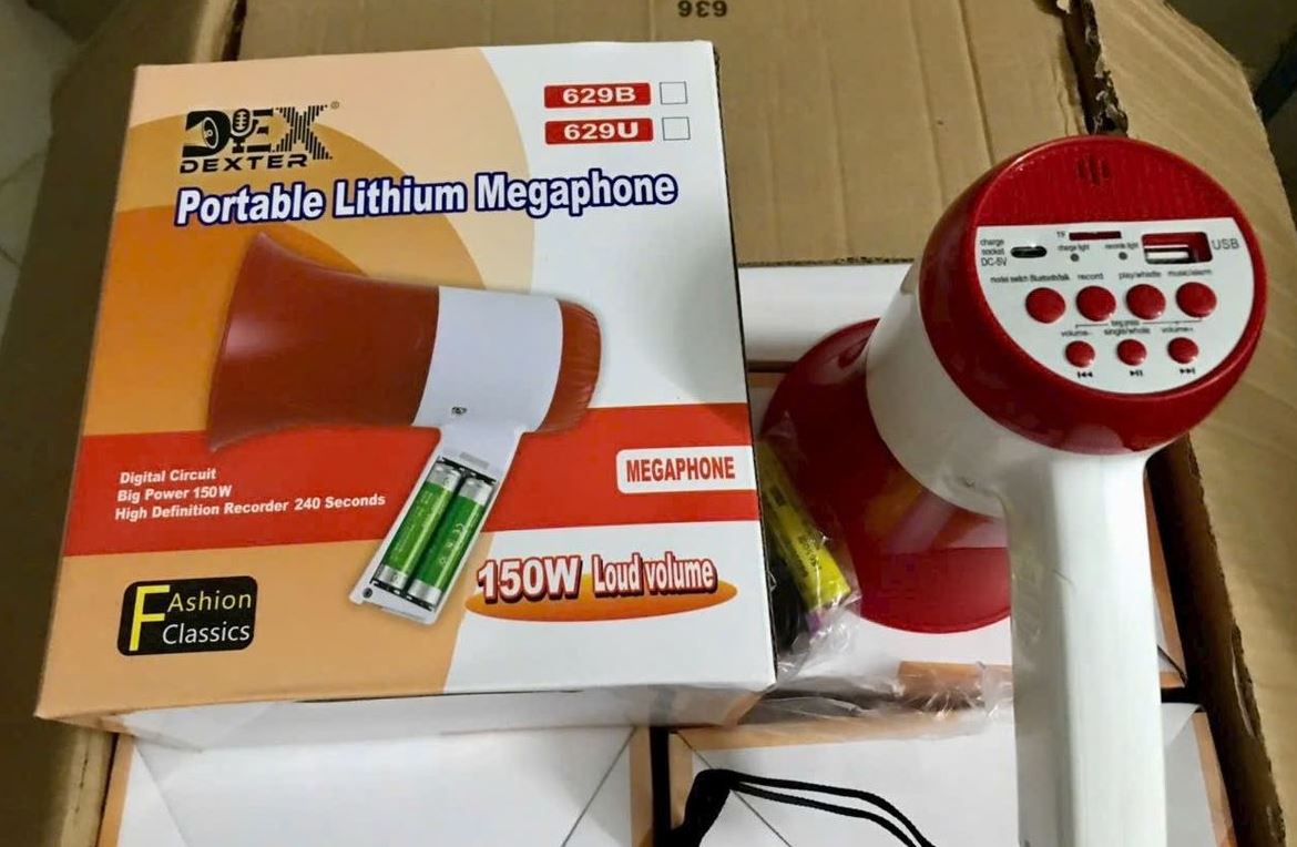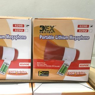 Sản phẩm được nhắc đến là Loa Megaphone DEXTER-629B (Loa phóng thanh 150W 2 PIN). Đây là một thiết bị truyền thông cầm tay được sử dụng để khuếch đại âm thanh, thường dùng cho mục đích bán hàng, thông báo hoặc truyền thông tin ở những nơi đông người.