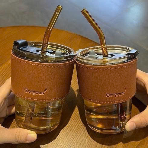 Sản Phẩm: LY THỦY TINH BỌC DA KÈM ỐNG HÚT 450ML**