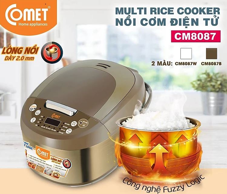 - Nồi cơm điện tử Comet CM8087 sử dụng công nghệ Fuzzy Logic đây là công nghệ dùng bộ vi xử lý thế hệ mới nhất để tự động điều chỉnh nhiệt độ nấu phù hợp với lượng gạo/loại gạo và nước trong nồi, giúp cơm nấu chín kỹ và ngon hơn kể cả khi bạn cho nhiều hay ít nước (sai số trong khoảng cho phép + 20% - 30%).