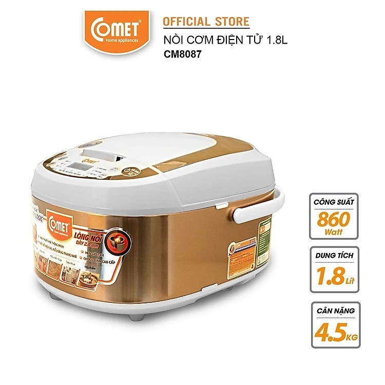 - Nồi cơm điện tử Comet CM8087 thiết kế sang trọng và hiện đại mang đến cho gia đình bạn những bữa cơm đầm ấm.