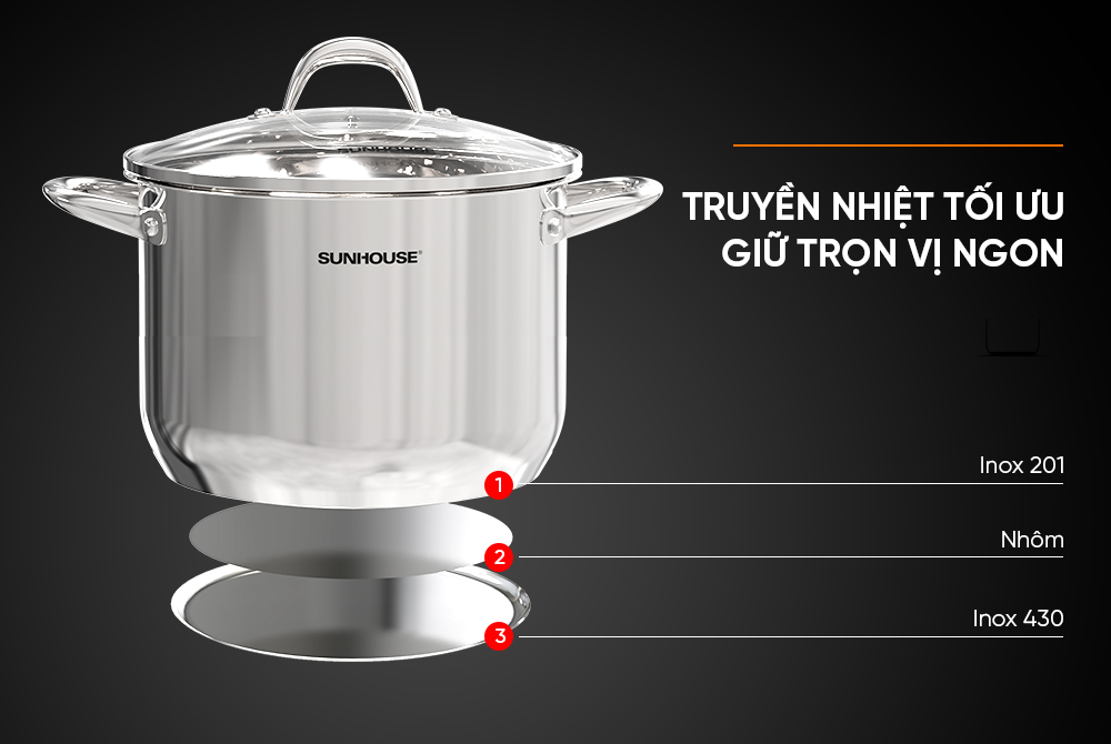 Nồi SHG301-32 của SUNHOUSE, loại nồi inox 3 đáy, sở hữu đáy 3 lớp dày, cho khả năng truyền nhiệt nhanh chóng và phân tán nhiệt đều, giúp tiết kiệm được thời gian và nhiên liệu trong quá trình nấu nướng.