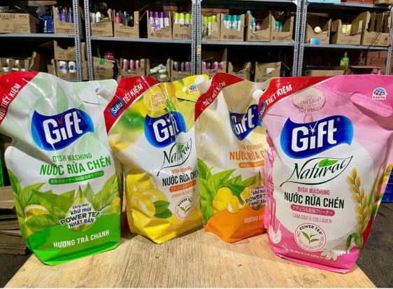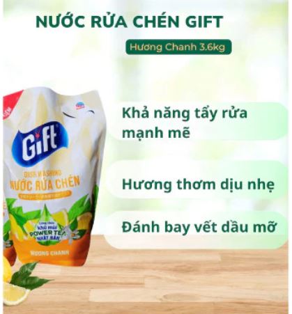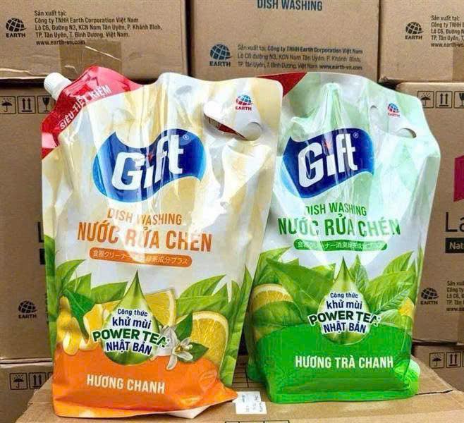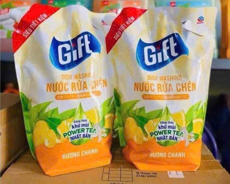 Nước rửa chén Gift dạng túi tiết kiệm với công thức đậm đặc, giúp đánh bay dầu mỡ nhanh chóng, làm sạch chén đĩa hiệu quả, an toàn cho gia đình.